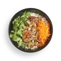 chicken in teriyaki sauce with sticky white rice, shredded carrots, pea shoots and onions. garnished with sesame seeds and served with a side of kimchee
