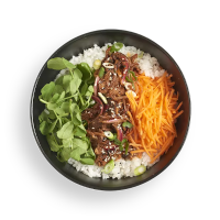 beef brisket in teriyaki sauce with sticky white rice, shredded carrots, pea shoots and onions. garnished with sesame seeds and served with a side of kimchee