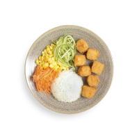 cod cubes deep-fried in panko breadcrumbs served with sticky white rice, carrot, cucumber and sweetcorn. served with amai sauce