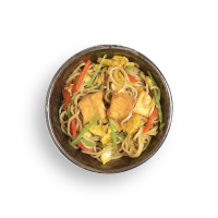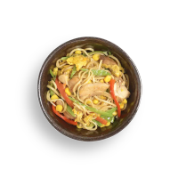 teppan-fried soba noodles with chicken, egg, sweetcorn, mangetout, peppers and amai sauce