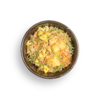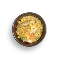 stir-fried white rice with chicken, egg, sweetcorn, carrot, mangetout and amai sauce