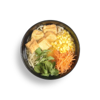 noodles in a vegetable soup topped with fried tofu, seasonal greens, carrot and sweetcorn
