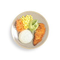 chicken breast deep-fried in panko breadcrumbs, served with sticky white rice, carrot, cucumber and sweetcorn. served with amai sauce